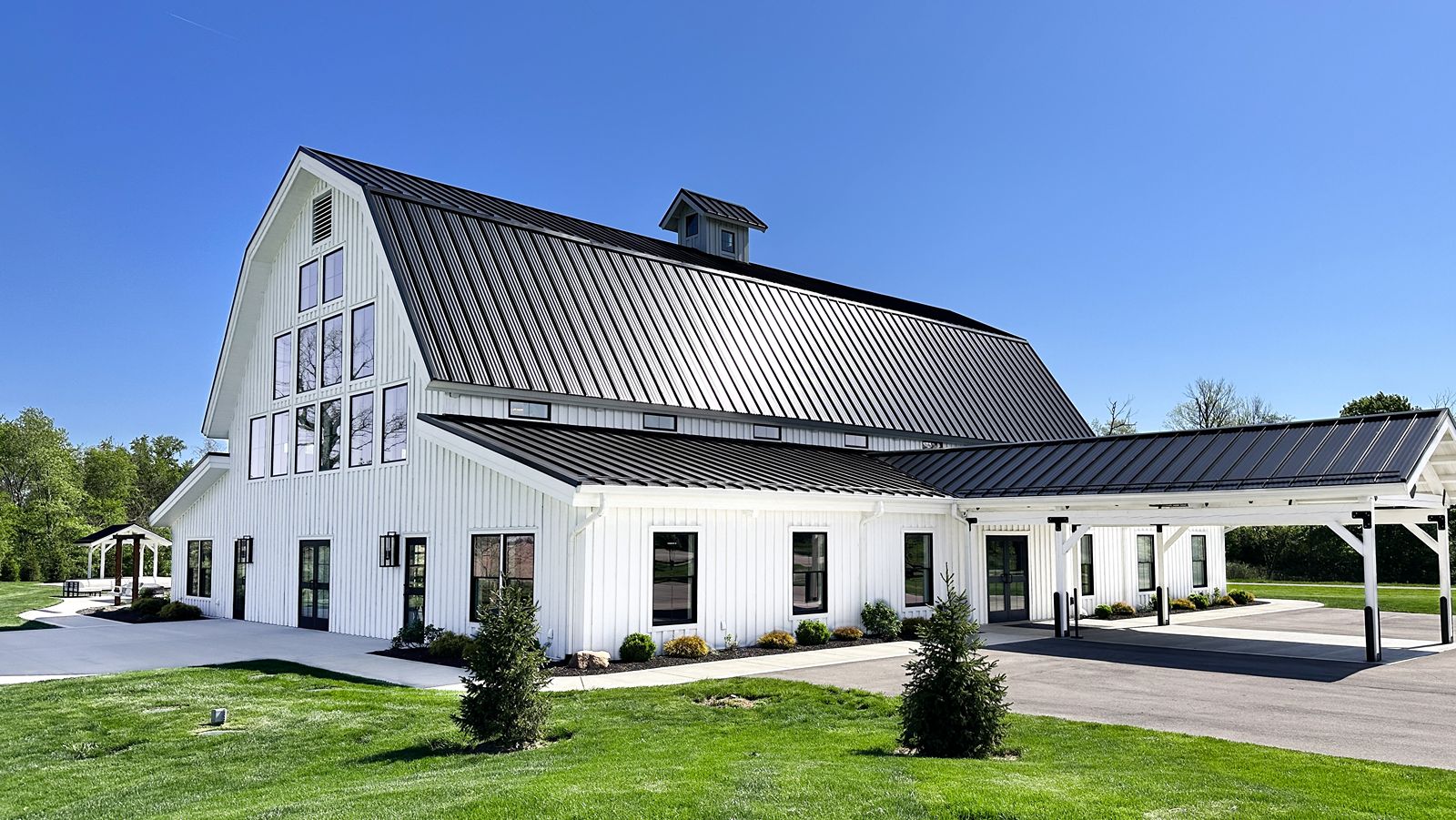 Restaurant dining area with navy booths and vaulted ceiling design.