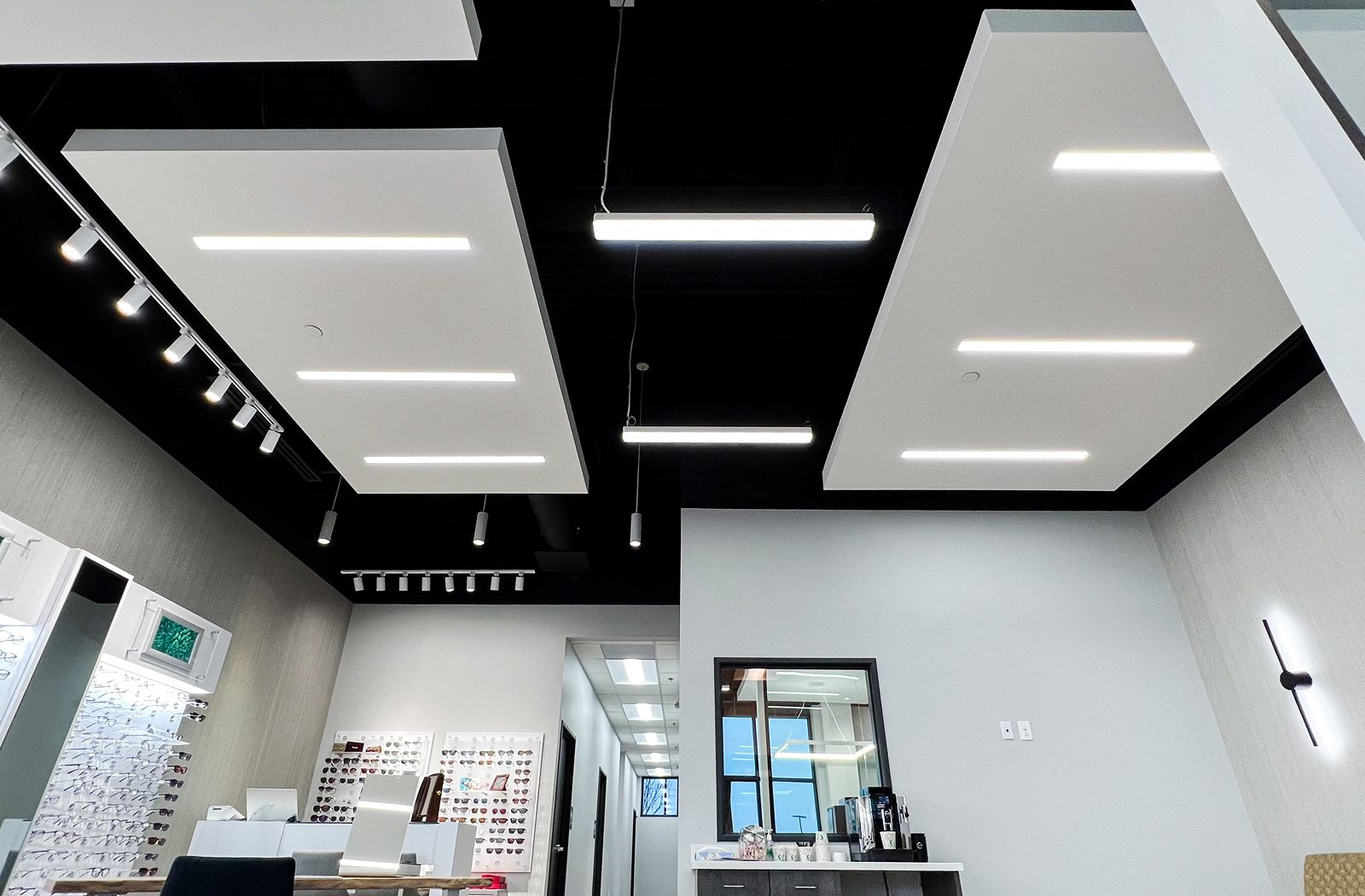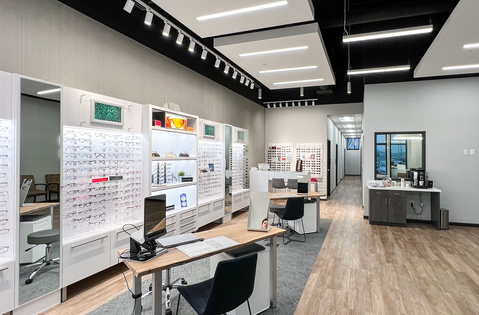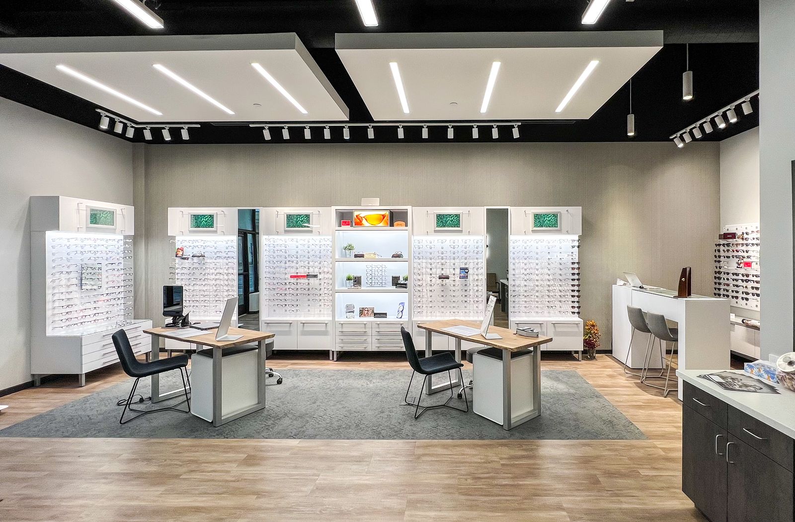 The finished design features comfortable and ergonomic workstations, modern finishes, and an inviting atmosphere that aligns with the brand’s image. The new space features an easy-to-navigate layout and clear signage. We partnered with Specified Lighting System to illuminate key areas of the retail walls as well as provide customized illuminance, luminance, and color temperature. When determining the appropriate lighting density or range for Camel Eyecare’s eyeglass retail space, several factors were considered, including the size of the space, the types of products being sold, and the desired atmosphere, as well as concerns like reducing eye strain and increasing productivity. Overall, Progress Studio was able to collaborate with the client, the architect, and Shamrock Builders to create a space that met all of the project requirements while also providing an optimal client experience.