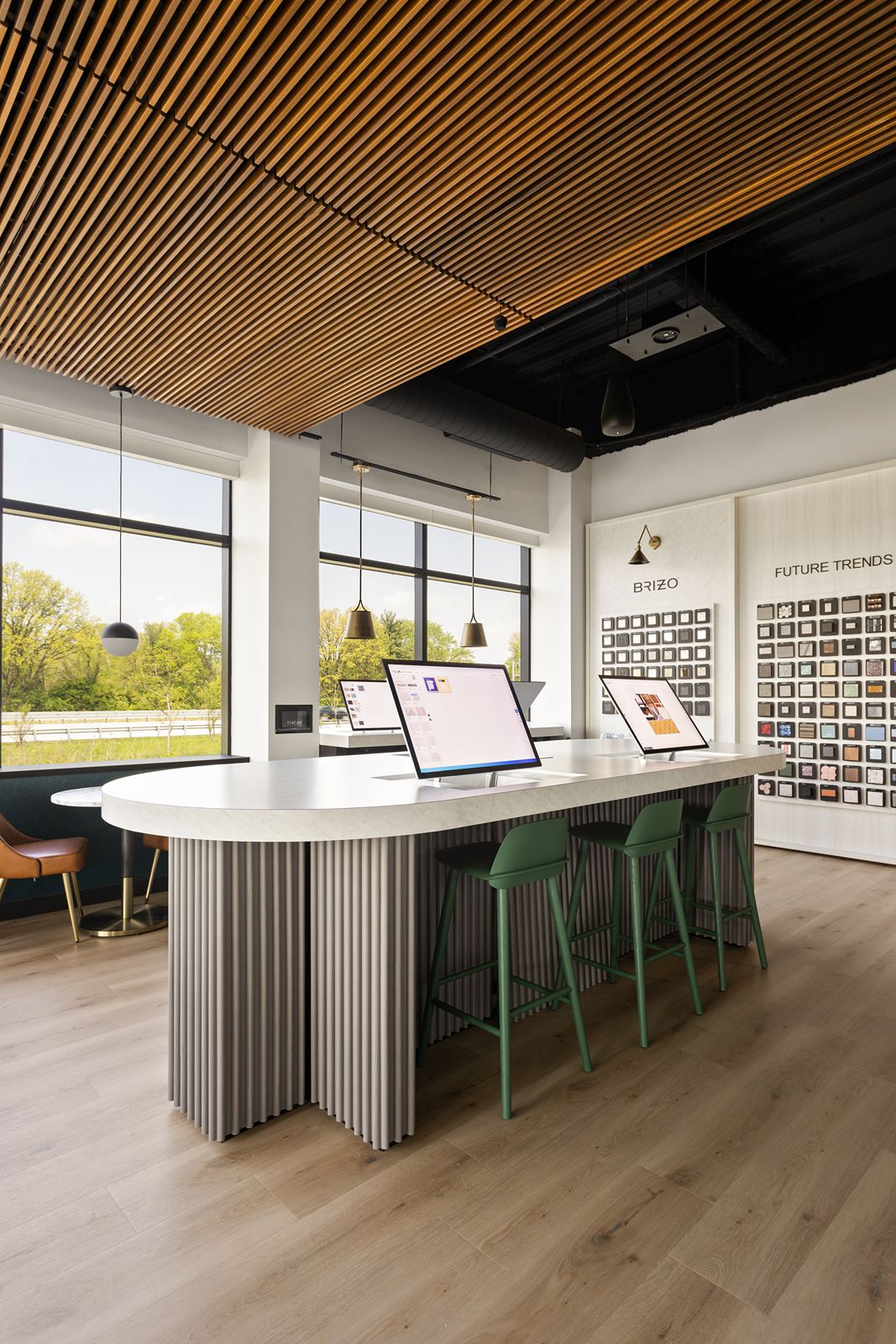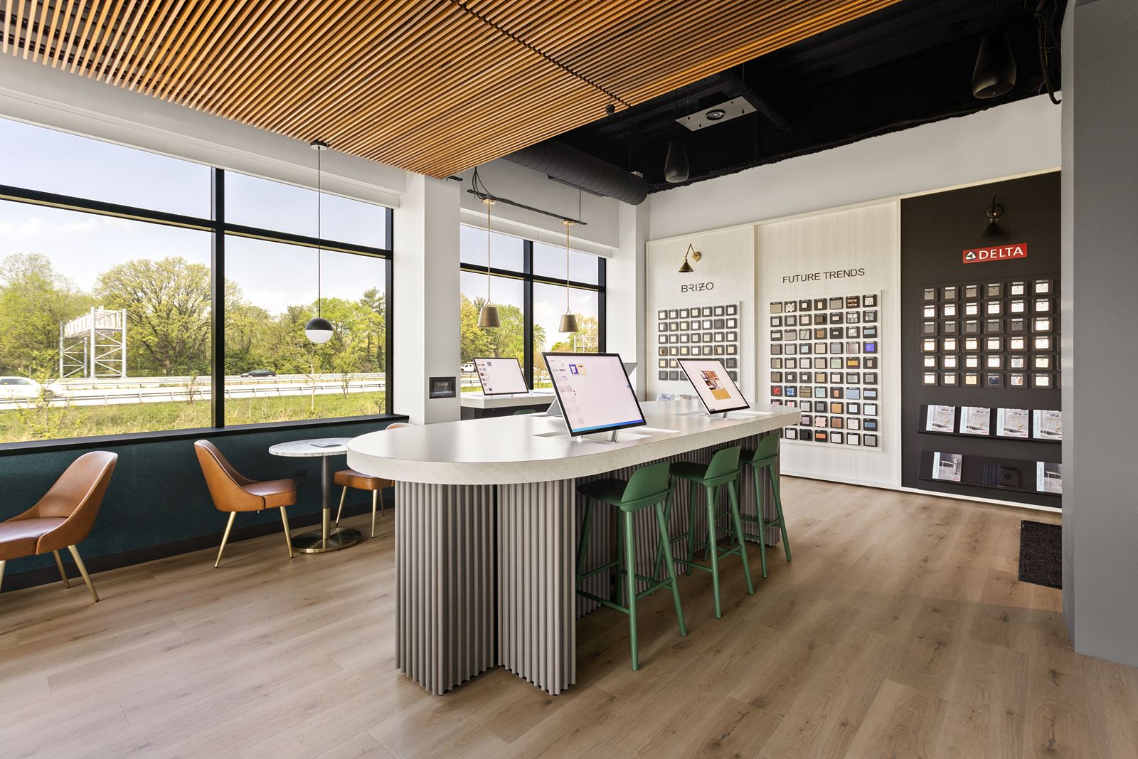 In collaboration with MaterialBank and Emergent Construction, the space features the latest in material choices, design trends, multimedia opportunities for presentations and educational videos, as well as an interactive space where creativity is fostered by two leading national brands, Delta Faucet and MaterialBank. We designed new interactive displays, a material display and selection, and custom seating options in the space.