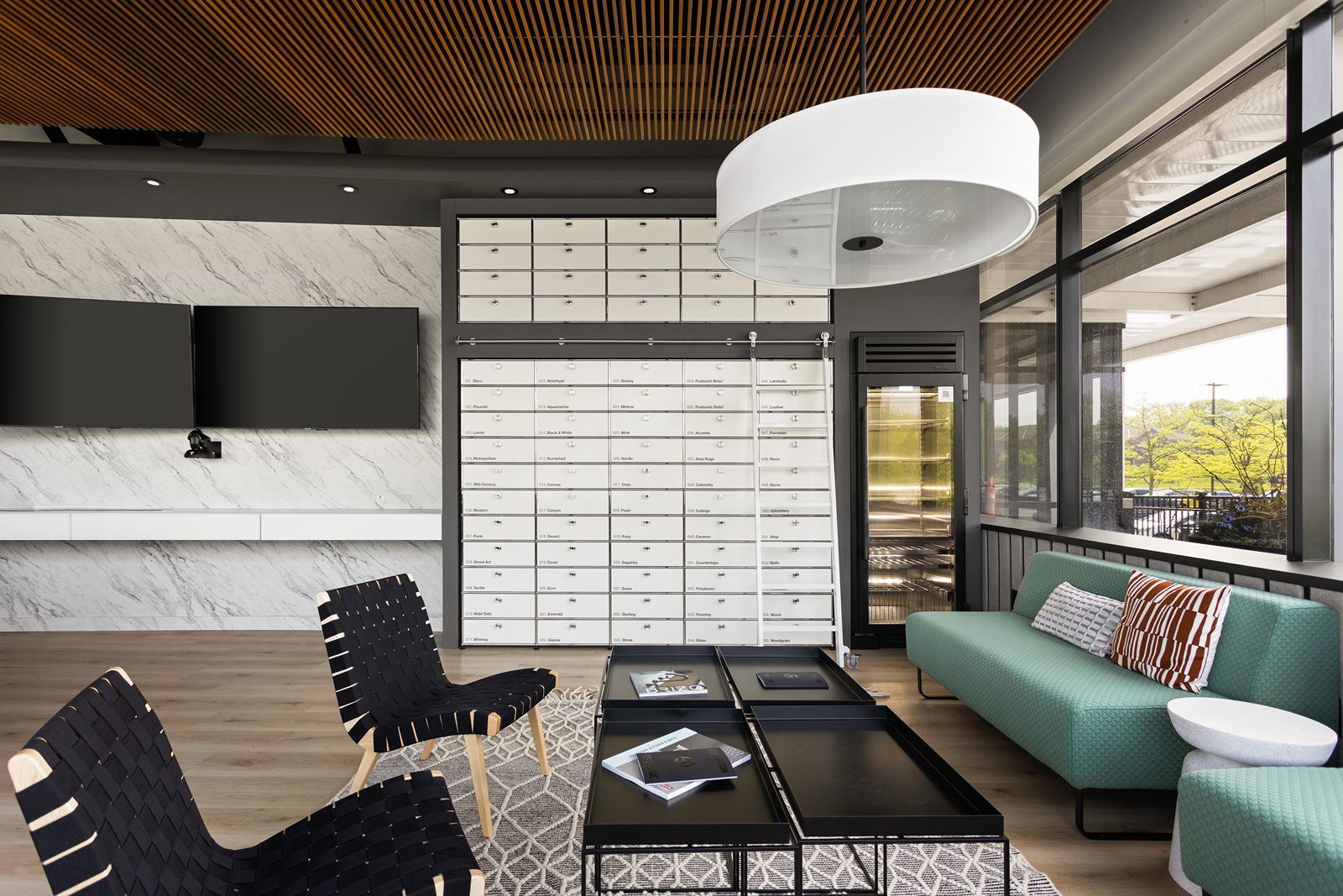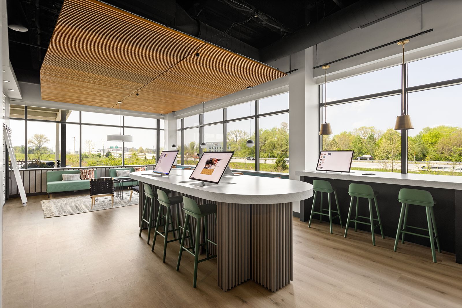 An interior renovation that serves as an interactive space for designers to explore the latest design trends, featuring large open windows for natural light and multimedia areas for design presentations.