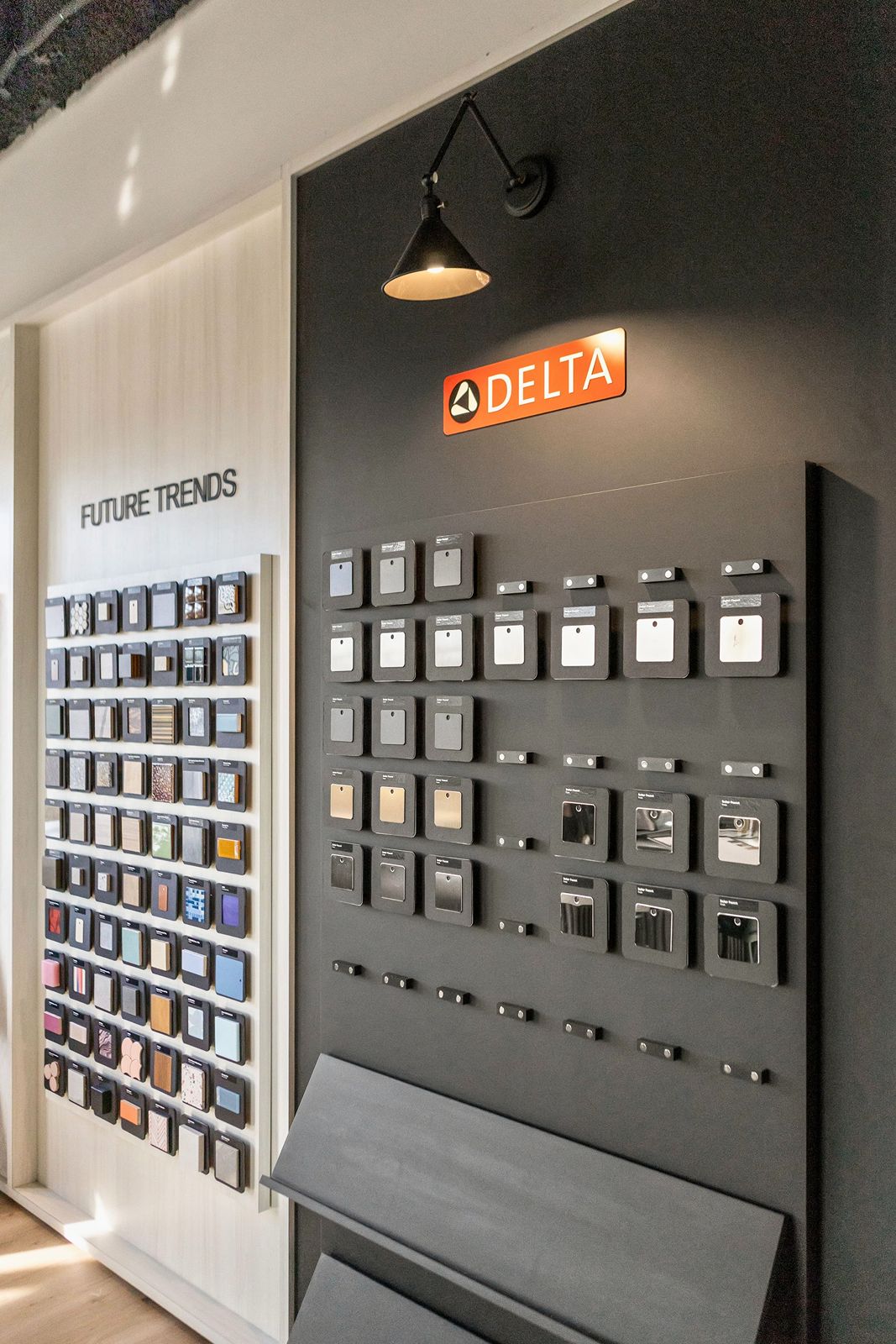Delta Faucet Company’s goal was to showcase and maintain the freshness of their showroom space as front-facing when having customers come to their global headquarters. They wanted a creative space where they could select interior design finishes together. They expressed the need for large interactive areas where several ideas could be brought together. Another objective was to provide easy-to-navigate displays for textiles and materials.