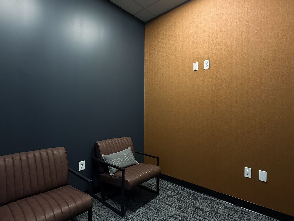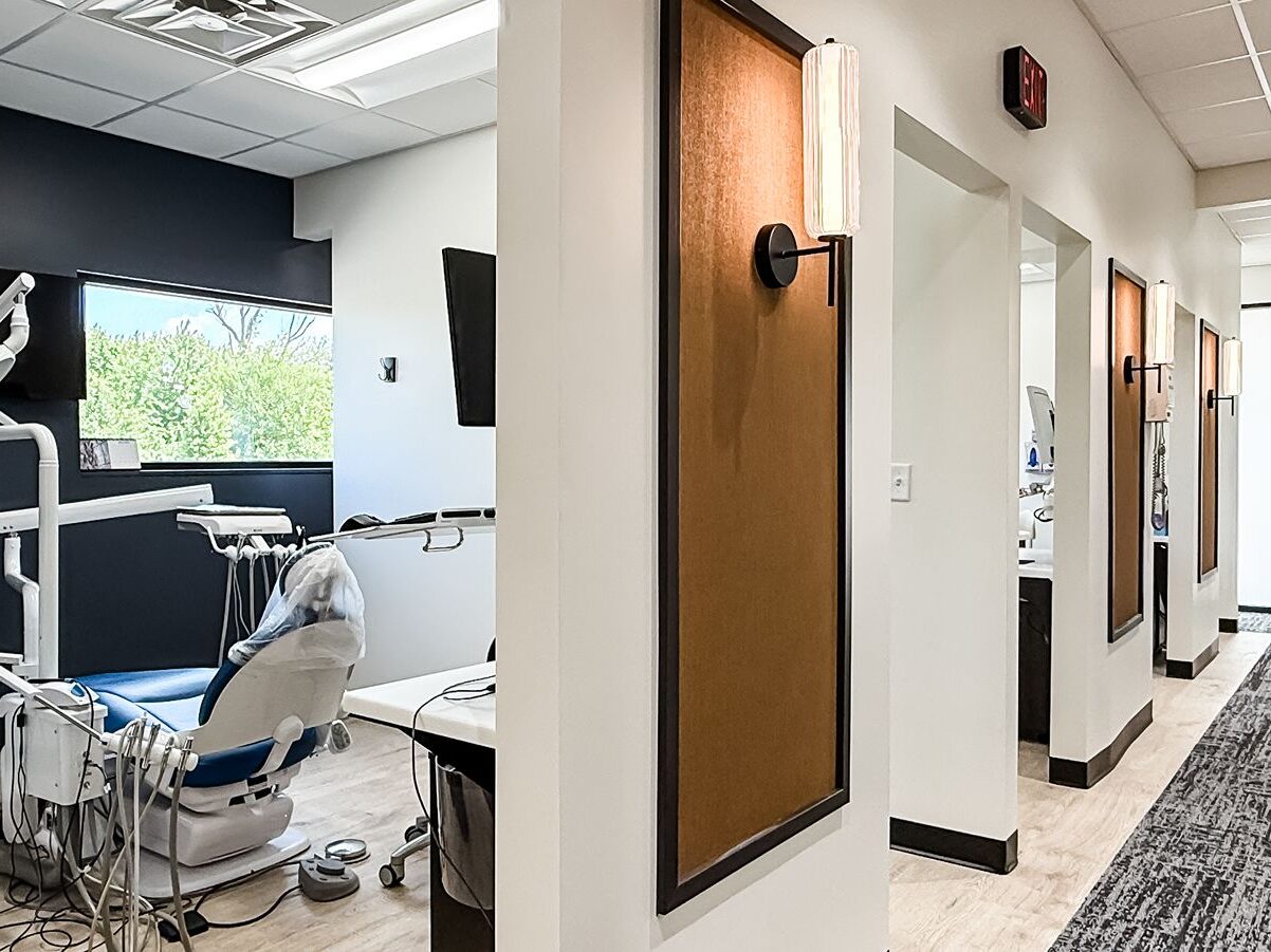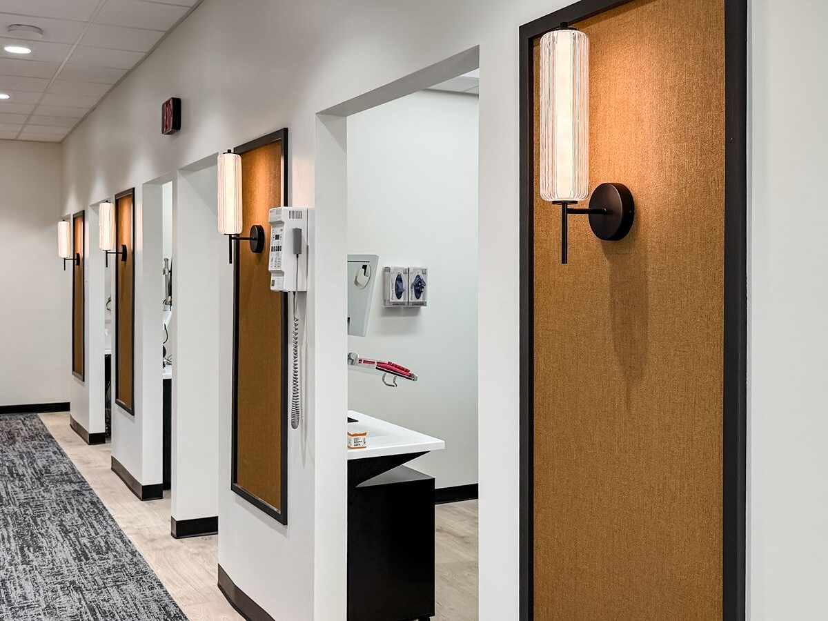 Progress Studio introduced high-impact elements at key touchpoints, such as vertical wood slat features in the entry and hallways, paired with warm sconces that add visual interest without adding cost. Accent walls and lighting were placed to create a calm, contemporary feel from the moment patients arrive.