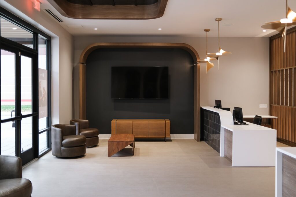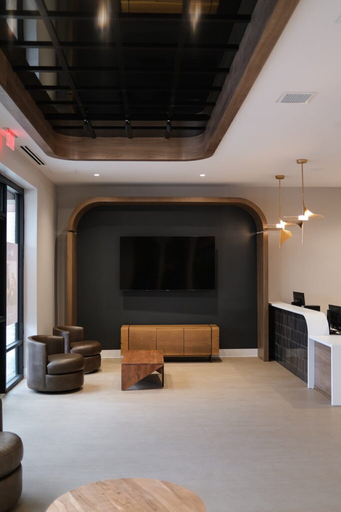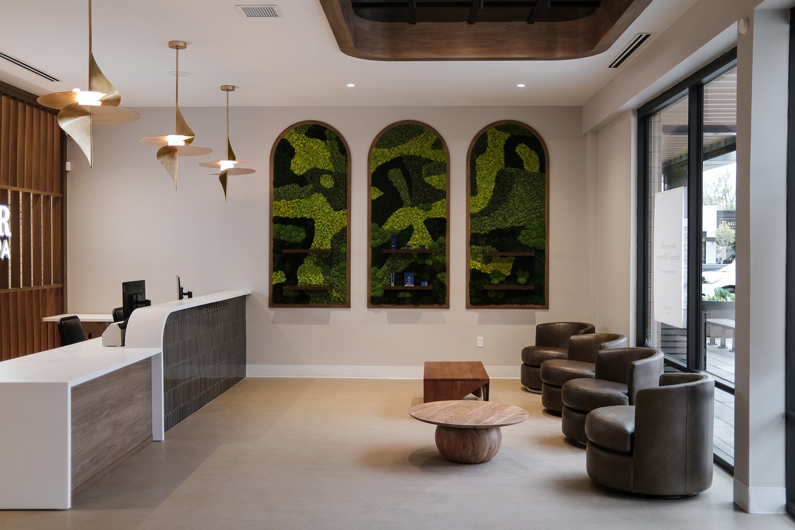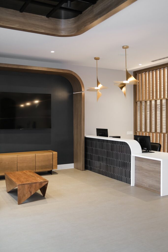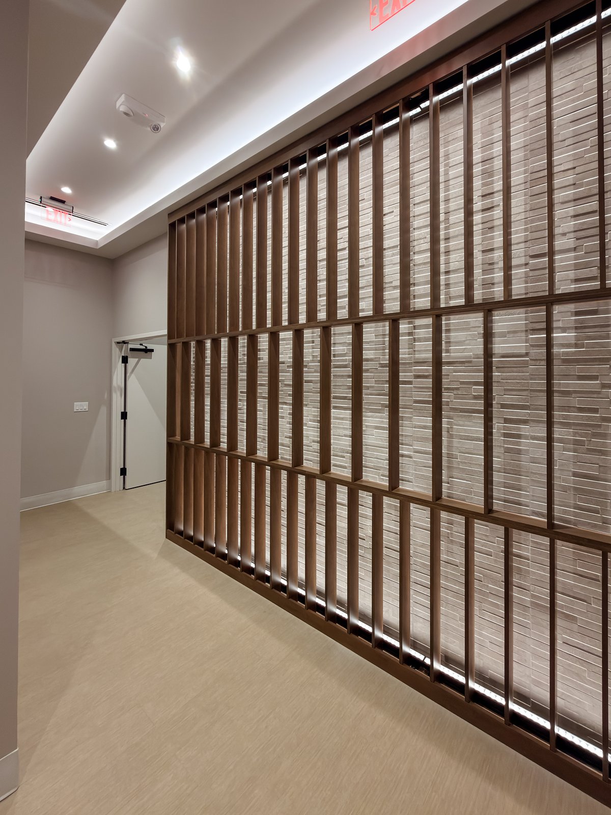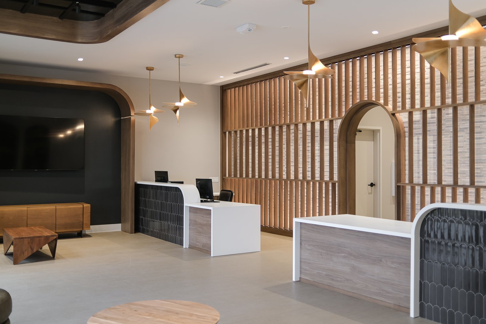 Progress Studio worked closely with the client on implementing the details outward, utilizing live render technology to support informed decisions around layout, finishes, and material combinations. From the moment clients arrive, they enter an expansive waiting room with bright natural light, a mirrored ceiling that lifts the space visually, and a wood lattice feature set against staggered stone look tile. These details create a warm and welcoming first impression.