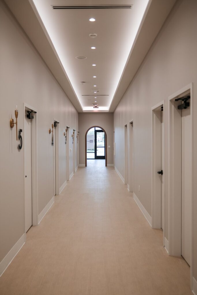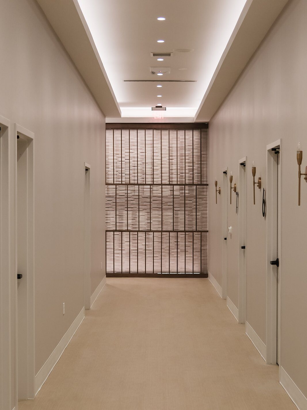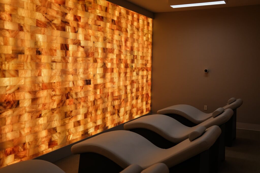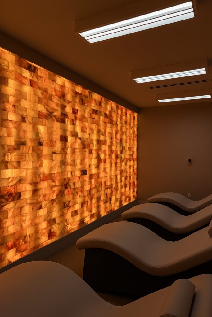The salt lounge features a glowing wall that creates a calm, softly lit environment for patient treatments. Throughout the clinic, recessed and cove lighting provide a clean and calming backdrop, paired with warm wood cabinetry and neutral surfaces that support daily clinical needs. Treatment rooms and corridors carry consistent material selections, creating a smooth flow from one space to the next. Restrooms feature gold fixtures, textured tile, and soft lighting that give the space a modern and polished feel.