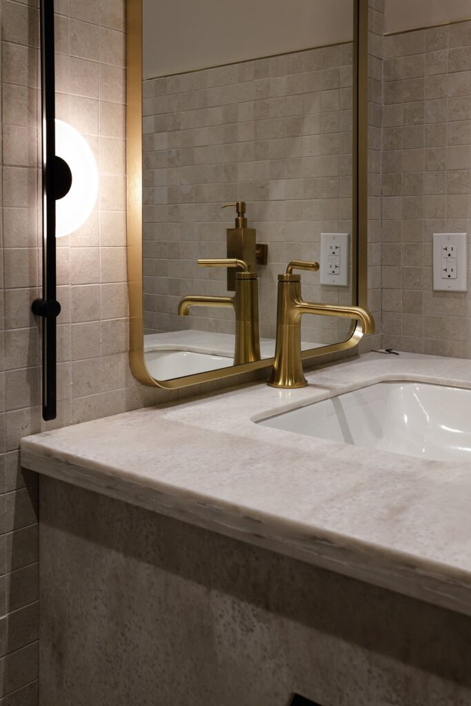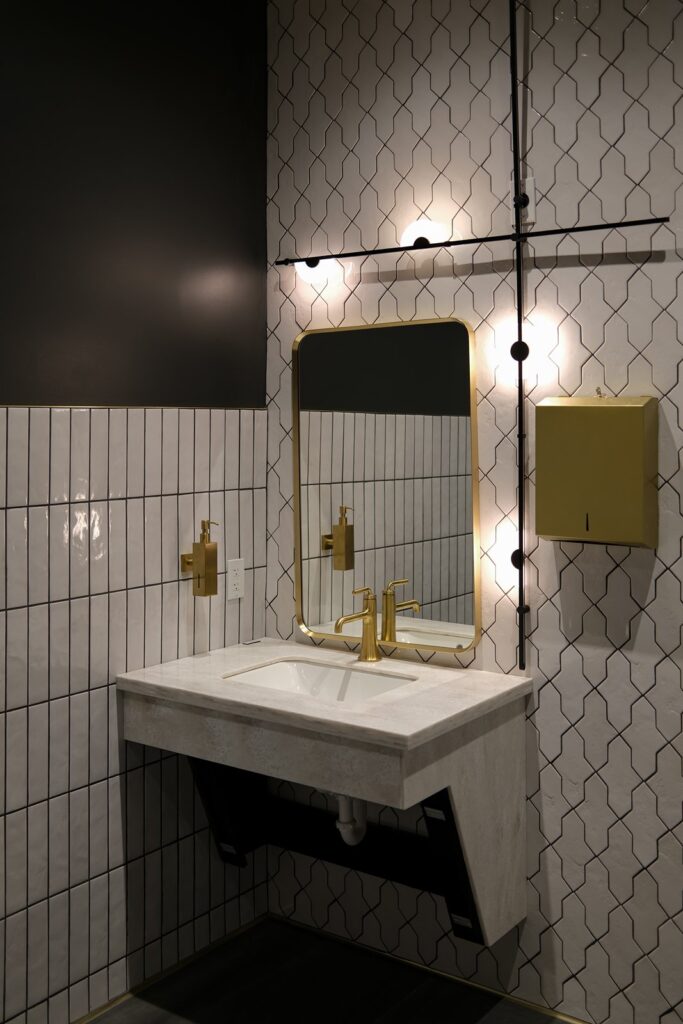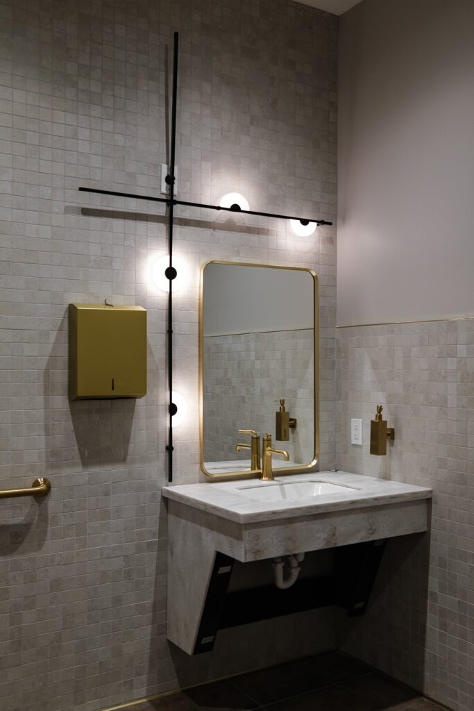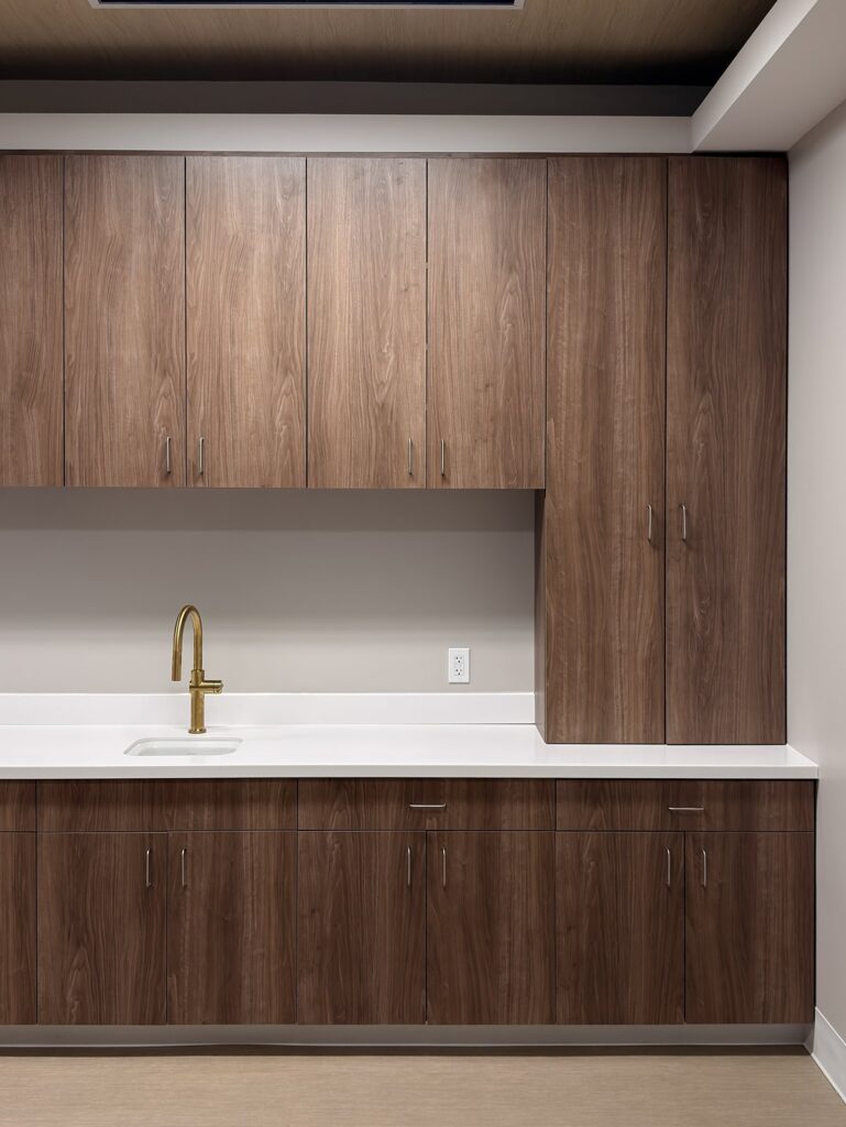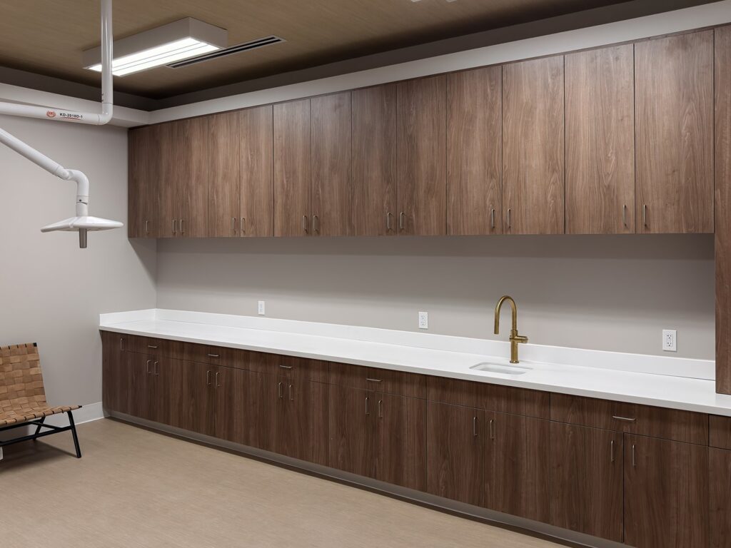 The salt lounge features a glowing wall that creates a calm, softly lit environment for patient treatments. Throughout the clinic, recessed and cove lighting provide a clean and calming backdrop, paired with warm wood cabinetry and neutral surfaces that support daily clinical needs. Treatment rooms and corridors carry consistent material selections, creating a smooth flow from one space to the next. Restrooms feature gold fixtures, textured tile, and soft lighting that give the space a modern and polished feel.