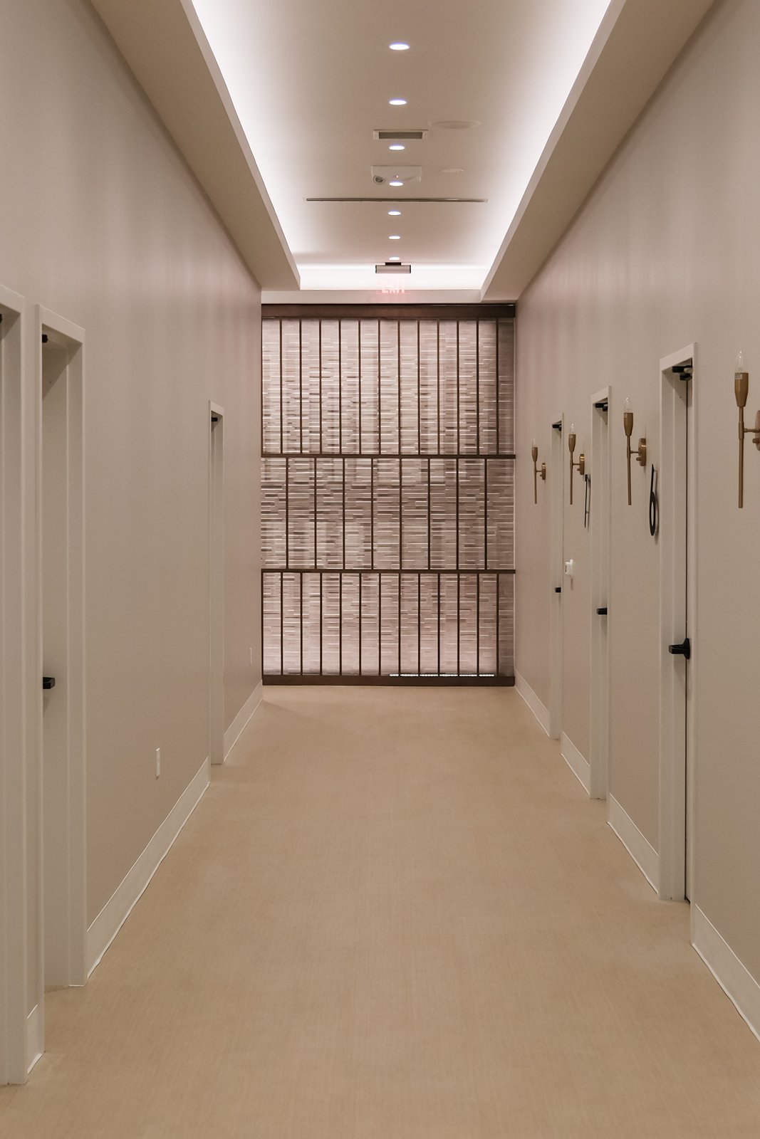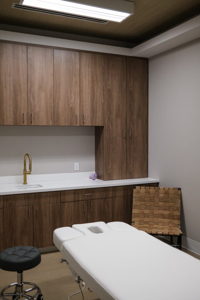 Initially looking at a smaller space, Dr. Harper quickly realized that a larger suite would better suit their needs, so design shifted mid-stream to the larger space within the same north side Indianapolis plaza in a more prominent location. The design goals around the project were to integrate multiple exam rooms set up for diverse treatments, as well as a salt lounge and other staff support spaces. Influenced by a recent skiing trip, the client wanted to incorporate certain detail elements while still fitting the brand’s image. This included layered lighting, warm natural textures, and modern fixtures that align with the practice’s aesthetic.