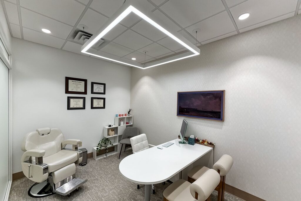 Progress Studio used its virtual tour workflow to help Dr. Liu review the design during early planning and make informed decisions about layout, lighting, and finishes. The plan organizes treatment areas, consultation rooms, and staff spaces around a clear circulation path that supports both patient comfort and staff workflow.