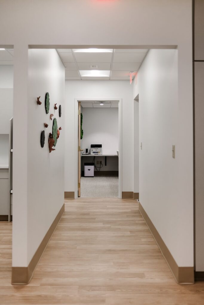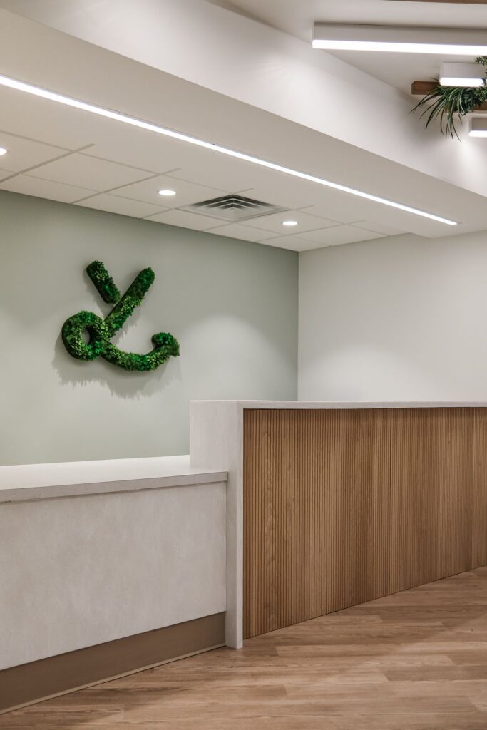 Natural materials were introduced throughout the interior to soften the clinical setting. Wood accents appear in doors, wall details, and the reception desk, while suspended greenery installations and moss inspired panels add texture and warmth to the environment. The reception area welcomes patients with soft lighting and a simple, modern desk that anchors the space.